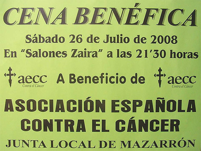 La Junta Local de la Asociación Española Contra el Cáncer (AECC) ha organizado para este sábado 26 de julio a las 21:30 h. una cena benéfica en los Salones Zaira de Mazarrón.
