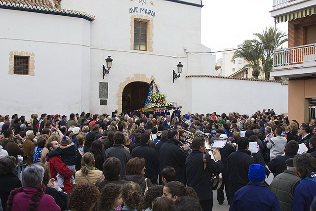 Tras la Misa oficiada por el párroco de Mazarrón, Julio Romero, miles de romeros a los que no les ha importado el frío matinal han acompañado a la Virgen en su tradicional camino hasta la playa.