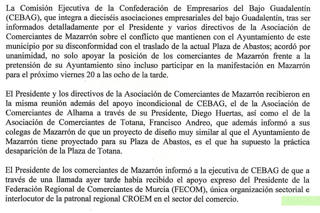 CEBAG apoya a los comerciantes de Mazarrón que se oponen a que su ayuntamiento traslada la Plaza de Abastos