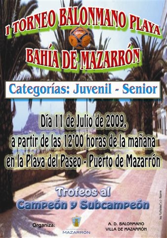 Este sábado, 11 de julio, tendrá lugar la primera edición del I Torneo de Balonmano Playa “Bahía de Mazarrón” a las 12:00 horas en la playa del Puerto, junto a la Plaza de las Comunidades Autónomas.