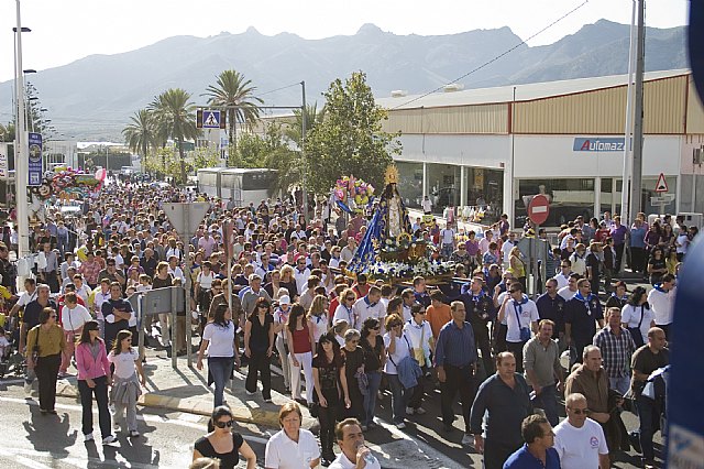 Posteriormente, los romeros han partido hacia Mazarrón, donde las notas principales han sido los vítores y las alabanzas a la Virgen, haciendo escala en la desaladora Virgen del Milagro, en Las Moreras y en el Jardín de La Purísima, donde la Imagen ha sido recibida por el Alcalde de Mazarrón, Francisco Blaya, y el Cura Párroco, Julio Romero, así como por el Concejal de Servicios, Salvador Ardil, la Concejala de Política Social, Yolanda Vivancos, el Concejal de Seguridad Ciudadana, Segundo Muñoz, y la Concejala de Atención a los Residentes Extranjeros, Jacqueline Gálvez, quienes han acompañado a la Imagen hasta llegar al Santuario de La Purísima.