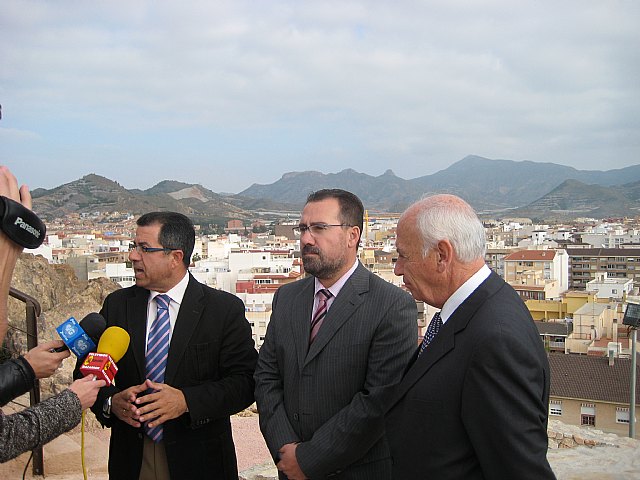 El director general de Patrimonio Natural y Biodiversidad, Pablo Fernández, junto con el responsable de relaciones institucionales de La Caixa en Murcia, José Antonio Meseguer, y el alcalde de Mazarrón, Francisco Blaya, presentó hoy los proyectos de restauración ambiental del Cerro de Molinete y de adecuación biológica del humedal de la Rambla de las Moreras.