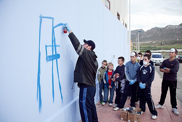 Este viernes los alumnos y alumnas del ‘Taller de Grafiti’, enmarcado en la programación ‘Mazajoven 2010’, han iniciado el diseño de la parte inferior de la fachada del Pabellón de Deportes de La Cañadica de Mazarrón.
