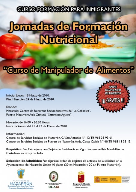 La Concejalía de Política Social del Ayuntamiento de Mazarrón ha organizado la segunda edición de las ‘Jornadas de Formación Nutricional’, que integran el ‘Curso de Manipulador de Alimentos’ destinado a las personas inmigrantes del municipio.