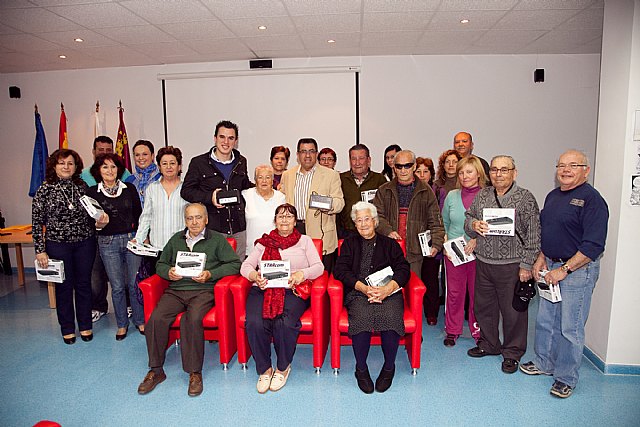 El alcalde de Mazarrón, Francisco Blaya, junto al concejal de Deportes, Francisco Antonio Raja, y la concejala de Política Social, Yolanda Vivancos, han entregado esta mañana unos cuarenta aparatos de Televisión Digital Terrestre a los mayores del Centro de Día de Mazarrón.