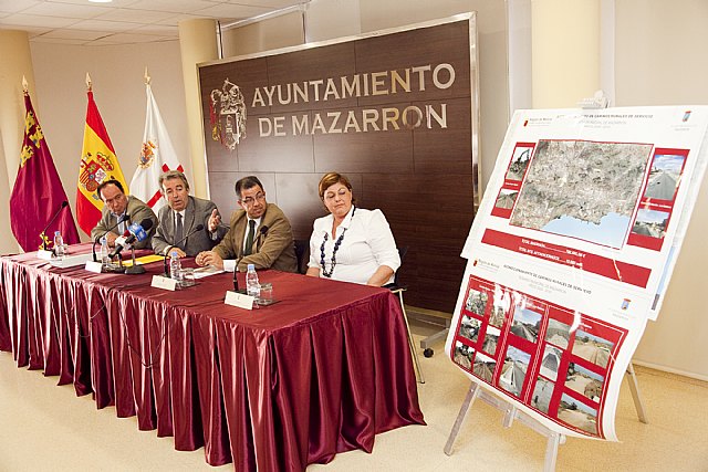El Alcalde de Mazarrón, Francisco Blaya, y el Consejero de Agricultura y Agua, Antonio Cerdá, acompañados por el Director General de Regadíos y Desarrollo Rural, Julio Antonio Bernal, y la Concejala de Agricultura y Desarrollo Rural, Luisa María Heredia, han presentado esta mañana el Plan de Acondicionamiento, Mejora y Construcción de Caminos Rurales de las pedanías del municipio.