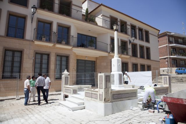 El Alcalde de Mazarrón, Francisco Blaya, y el Concejal de Infraestructuras y Urbanismo, José Antonio Román, junto al Arquitecto de la obra, Rafael Pardo Prefasi, han visitado las obras de restauración y remodelación de la fuente histórica de la Plaza Ramón y Cajal.