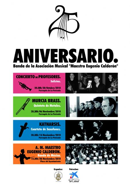 La Asociación Musical de Mazarrón cumple sus bodas de plata con cuatro magníficas citas con la música como: el 'concierto de profesores' –solistas-, 'Murcia Brass' –quinteto de metales-, 'Katharsis' –cuarteto de saxofones- y la 'Asociación Musical Maestro Eugenio Calderón' –banda de música-.