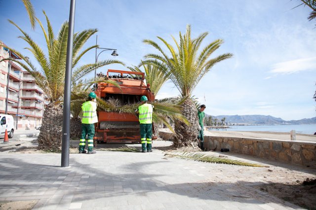 El Alcalde de Mazarrón, Francisco Blaya, y el concejal de Servicios, Salvador Ardil, han supervisado la poda de las palmeras de la zona que están desarrollando los trabajadores del Ayuntamiento. Esta labor de jardinería tiene lugar en este mes, coincidiendo con la temporada invernal.