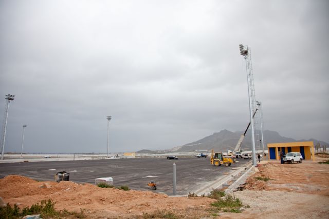 El Alcalde de Mazarrón, Francisco Blaya, acompañado por los concejales de Infraestructuras y Deportes, José Antonio Román y Francisco Antonio Raja, han supervisado las obras de ejecución de los dos campos de fútbol de césped artificial en el nuevo complejo deportivo de la Media Legua.