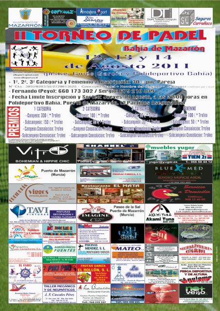 También se contempla en cada categoría la realización de un cuadro de consolación, por lo que se asegura que cada pareja juegue al menos dos partidos. Para más información se puede llamar al teléfono 679210439. El torneo ha sido organizado por la asociación deportiva "SFBSPORT" y cuenta con la colaboración del Ayuntamiento de Mazarrón a través de la concejalía de Deportes.