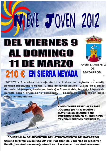 La concejalía de Juventud del Ayuntamiento de Mazarrón ha organizado un viaje a Sierra Nevada que se realizará entre los días 9 y 11 de marzo. El viaje incluye dos noches de alojamiento en el hostal "El Ciervo" en régimen de media pensión, es decir, con desayuno y cena. El precio del viaje para los jóvenes de entre 14 y 30 años que quieran divertirse practicando el esquí es de 210 euros, mientras que para el resto de adultos es de 220 siempre que estén empadronados en el municipio. Aquellos ciudadanos que no estén empadronados deberán abonar 230 euros para apuntarse.
