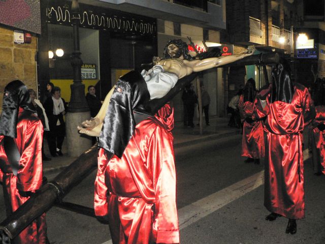Abría el cortejo la Cruz Guía seguida del estandarte del Cabildo de Cofradías de Semana Santa de Mazarrón y el de la Cofradía de la Virgen de la Soledad, cuyos penitentes desfilaban ayer con capuz negro y túnica roja. A continuación, una banda de tambores rompía el silencio de la noche mazarronera. Tras el estandarte del titular de la procesión, desfilaban los penitentes que portaban simuladas velas en las que ardían llamas de queroseno.