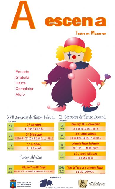 Hoy comienza en la Universidad Popular de Mazarrón una nueva edición de "A escena". Este festival de teatro infantil, juvenil y adulto cuenta este año con una decena de actuaciones que se desarrollarán durante todo este mes de mayo. El "Grupo Alquimia" del colegio concertado "Siglo XXI" abre hoy las XII Jornadas de Teatro Juvenil con la puesta en escena, a partir de las 8 de la tarde, de "La Comedia Dell Arte". Mañana viernes 4, a la misma hora, le toca el turno al I.E.S. "Domingo Valdivieso" que representará la obra "Un marido de ida y vuelta".