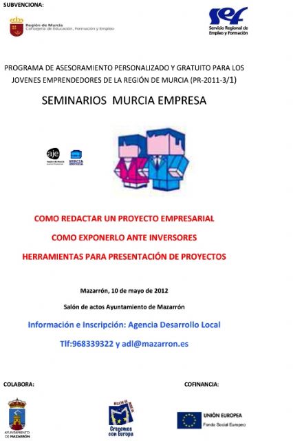 El seminario se encuadra dentro del Programa de Asesoramiento Personalizado Gratuito para los Jóvenes Emprendedores de la Región de Murcia y está financiado por la consejería de Educación, Formación y Empleo de la Comunidad Autónoma de la Región de Murcia a través del Servicio Regional de Empleo y Formación (SEF). El seminario está cofinanciado por el Fondo Social Europeo de la Unión Europea y cuenta con la colaboración del Ayuntamiento de Mazarrón. Para más información se puede llamar al teléfono 968 33 93 22.