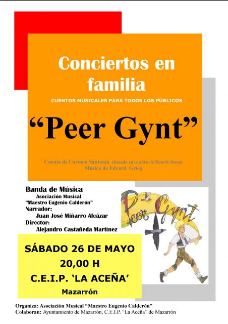 La Asociación Musical "Maestro Eugenio Calderón" va a llevar a cabo el segundo concierto del ciclo cultural "Conciertos en familia" con la puesta en escena del cuento musical "Peer Gynt", una historia para niños que narra las aventuras y desventuras de un pícaro y fantasioso personaje que jamás se hizo adulto. El concierto tendrá lugar el próximo sábado 26 de mayo a partir de las 8 de la tarde en el colegio "La Aceña" de Mazarrón