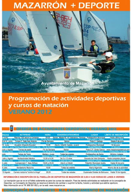 Como en pasados años una prueba deportiva volverá a destacar este verano por su importancia y poder de convocatoria. Se trata de la carrera nocturna "Todos Contra la Droga" que se ha pasado a celebrar el 28 de julio pero en el mismo lugar, la explanada de las Erosiones de Bolnuevo. Pero además, la Sierra del Algarrobo será el paraje por la que discurra una ruta senderista nocturna el 9 de julio y la Playa del Puerto el escenario del torneo "24 Horas de Fútbol Playa" que se disputará los días 6 y 7 de agosto. Las inscripciones se pueden realizar en la concejalía de Deportes en el pabellón "La Aceña" de 09:00 a 14:00 horas. Asimismo, se han editado unos folletos con las hojas de inscripción para los cursos de natación que tendrán un precio de 25 euros para los niños y de 30 euros para los cursos de mantenimiento.
