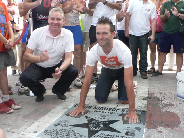 El ciclista murciano y campeón de España de ciclismo en ruta, José Joaquín Rojas, ha inaugurado esta tarde junto al Alcalde de Mazarrón, Ginés Campillo, el "Paseo del Deporte". Rojas se ha convertido así en el primer deportista en plasmar sus manos en una placa situada en el paseo marítimo de Puerto de Mazarrón donde en años venideros irán dejando su impronta otras figuras del deporte nacional e internacional.