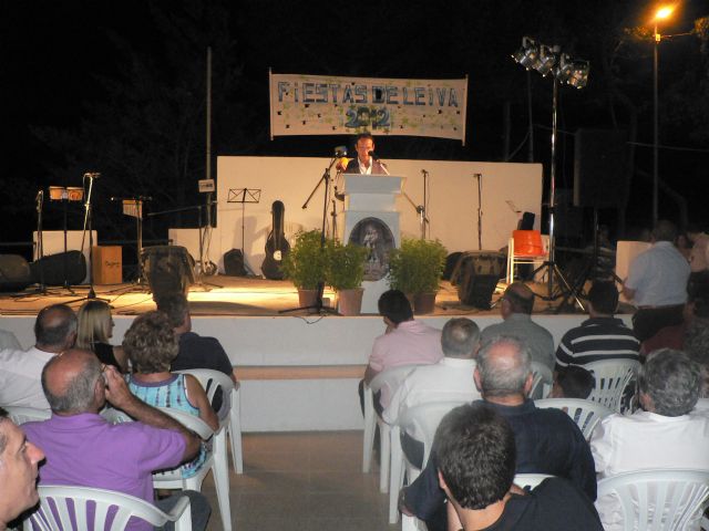 Tras la inauguración se llevó a cabo el pregón de las fiestas de este año que corrió a cargo de Francisco García Romero, ingeniero técnico agrícola afincado en Totana pero que pasó su infancia y adolescencia en Leiva. El pregonero estaba muy emocionado porque "aunque me he establecido en otro lugar, siempre me he sentido muy unido a esta tierra y a sus gentes" de las que resaltó "la calidad humana de las personas que viven aquí". Entre los recuerdos que dibujaron una sonrisa entre los presentes, el pregonero rememoró "los traqueteos de la carreta en la que nos subíamos los niños para ir al cine que se proyectaba en el teatro de La Majá (La Majada)".