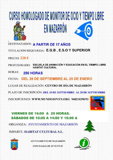 El curso se desarrollará del 28 de septiembre al 25 de enero y cuenta con un total de 250 horas lectivas. El horario del mismo será los viernes de 16 a 20 horas y los sábados de 10 a 14 y de 16 a 20 horas, y se impartirá en el Centro de Día de Mazarrón. Se pueden inscribir en él los mayores de 17 años que posean, como mínimo, el Graduado Escolar o equivalente, y su precio es 220 euros. El profesorado que impartirá el curso pertenece a la Escuela de Animación y Educación en el Tiempo Libre "Hábitat Cultural".