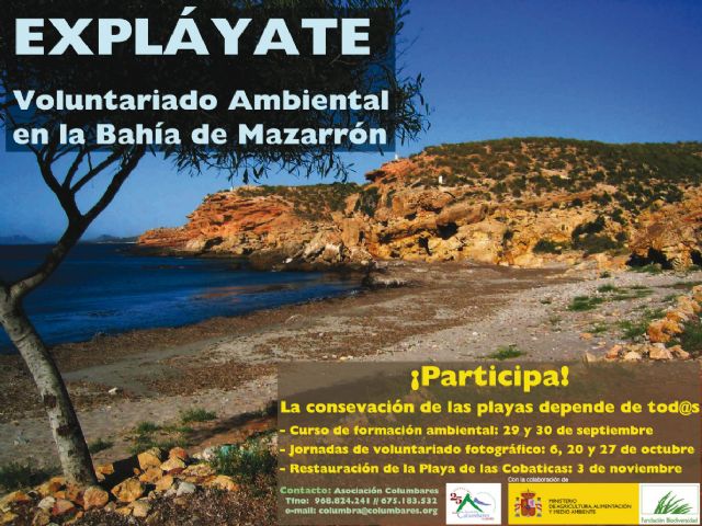 La Asociación Columbares va a celebrar este sábado 27 de octubre las III Jornadas Fotográficas del proyecto de voluntariado medio ambiental en la Bahía de Mazarrón titulado “Expláyate”. Este proyecto está realizando diferentes acciones de sensibilización ambiental y restauración de playas para involucrar a la población local y a los turistas en la conservación y restauración ambiental de zonas degradadas. Además, se está trabajando con los usuarios de la pesca deportiva para promover hábitos de pesca sostenible.