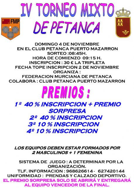 Está previsto que hasta Puerto de Mazarrón se desplacen cerca de 150 jugadores que lucharán, no sólo por hacerse con alguno de los premios de este torneo, sino también por puntuar dentro de este encuentro valedero para participar en el Campeonato de España de Petanca de Tripleta Mixta. La inscripción por equipo es de 30 euros y puede formalizarse en la Federación Murciana de Petanca o a través de los teléfonos 968 626 614 ó 627 420 144, hasta el próximo viernes 2 de noviembre.