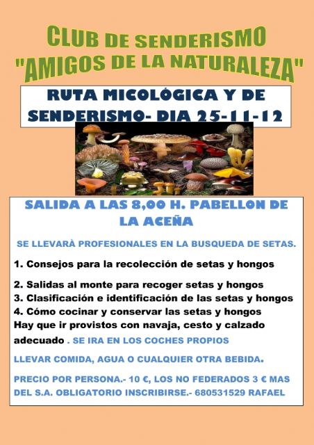 El Club de Senderismo "Amigos de la Naturaleza" va a celebrar este domingo 25 de noviembre unas jornadas micológicas y ruta de senderismo cuyo principal objetivo es que los participantes aprendan a diferenciar qué setas y hongos son comestibles y cuáles no lo son. Para ello, la cita contará con 2 monitores profesionales en la búsqueda de setas y en ella colabora el club "Falco" de la localidad de Cehegín.