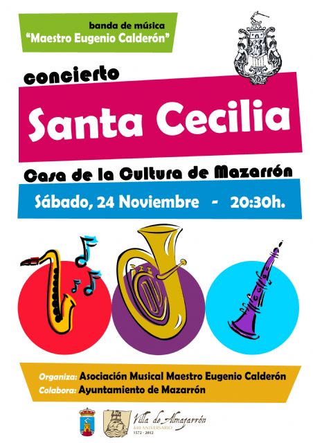 La banda de música de la Asociación Musical "Maestro Eugenio Calderón" celebrará su tradicional concierto en honor a Santa Cecilia el próximo sábado 24 de noviembre, a partir de las 20:30 horas en el nuevo edificio de la Casa de la Cultura de Mazarrón. Durante el concierto tendrá lugar el acto de bienvenida a los nuevos músicos de la banda, con la imposición del pin con el escudo de la asociación a cada uno de ellos. La entrada al concierto es totalmente gratuita. Esta actividad cuenta con la colaboración del Ayuntamiento de Mazarrón.