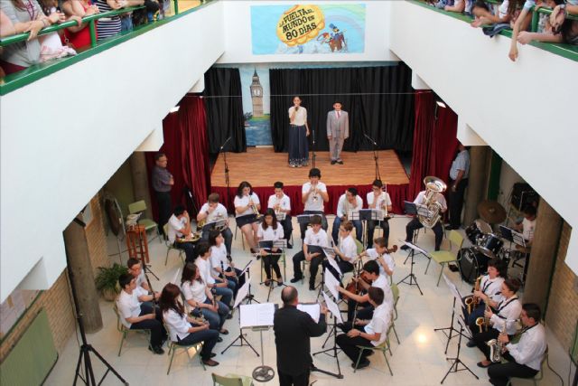 Este pasado sábado 18 de mayo y dentro del programa "Conciertos en familia: cuentos musicales para todos los públicos", el grupo de teatro del colegio "La Aceña" y la Banda de Música de la Asociación Musical "Maestro Eugenio Calderón" pusieron en escena "La vuelta al mundo en 80 días". En torno a trescientas personas disfrutaron de esta obra, un cuento musical de producción propia, cuya iniciativa nace en la Asociación musical, pero en cuya realización se han involucrado tanto el Colegio "La Aceña" como Rafael García Castillo, responsable de la adaptación que resume la obra de Julio Verne, alternando narración, teatro y música.
