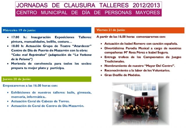 El Centro de Día de Personas Mayores de Mazarrón inicia mañana tres días repletos de actos con los que se clausurarán los talleres que se han llevado a cabo durante el curso 2012-2013. Dicha programación comienza este miércoles 19 de junio con la inauguración, a partir de las 17 horas, de la exposición en la que se muestran los trabajos realizados durante los talleres de pintura, bolillo, costura, manualidades, etc. A las 18 horas, está prevista la actuación del grupo de teatro "Atardecer" del Centro Social de Mayores de Puerto de Mazarrón que llevará a escena la obra "Celos mal reprimidos", una adaptación de "La Verbena de la Paloma", a la que seguirá una merienda de convivencia para todos los socios.