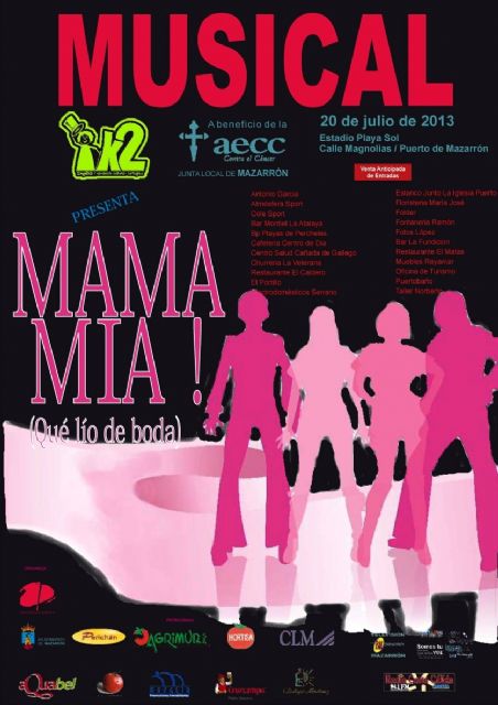 El conocido musical "Mama Mía (Qué lío de boda)" llega a Puerto de Mazarrón para recaudar fondos a beneficio de la Junta Local de Mazarrón de la Asociación Española Contra el Cáncer (AECC). La representación tendrá lugar el sábado 20 de julio en el estadio "Playasol" a partir de las 21:30 horas y ha sido promovida por la Universidad Popular de Mazarrón (UPM) con el patrocinio de diversos organismos y empresas entre los que se encuentra el Ayuntamiento de Mazarrón. El espectáculo fue presentado ayer por el Alcalde de Mazarrón, Ginés Campillo, la presidenta de la Junta Local de la AECC en Mazarrón, Luisa Mª Heredia, el director de la UPM, José María López, y los representantes de la asociación "Implik2", Víctor Cámara y Raquel Solano.