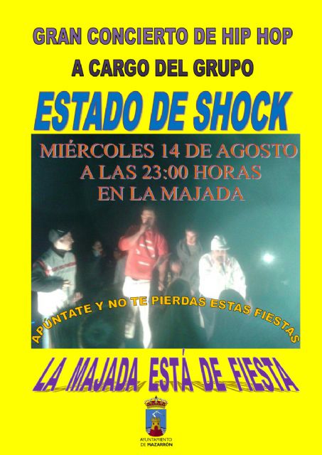 Aunque la pedanía de Majada celebra sus fiestas a principios de septiembre, durante el mes de agosto son varias las actividades que junto a la iglesia se desarrollan para ir calentando motores de cara a los días grandes de los festejos que se desarrollan en honor a La Purísima. Así, este miércoles 14 de agosto tendrá lugar un concierto gratuito de hip hop a cargo del grupo mazarronero "Estado de shock", que actuará a partir de las 22:30 horas.