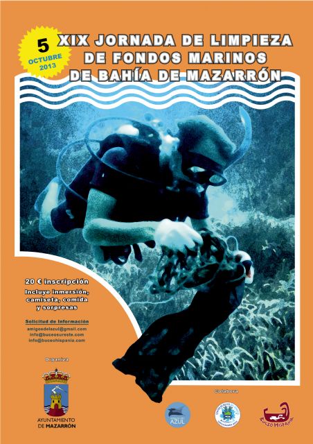 Este sábado 5 de octubre se celebra en aguas de la Bahía de Mazarrón la XIX Jornada de Limpieza de Fondos Marinos que ha sido organizada por el Ayuntamiento de Mazarrón a través de la concejalía de Servicios del Litoral. Se trata de la cita más antigua de España en lo que se refiere a este tipo de iniciativas y en la misma participarán los centros de buceo 'Amigos del Azul', 'Hispania' y 'Centro del Buceo del Sureste – Bachisub', quienes colaborarán en el desarrollo de la misma.