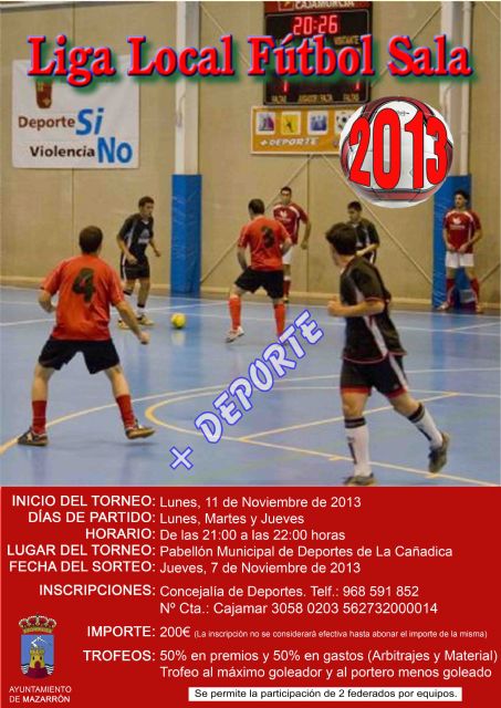 Ya está abierto el plazo de inscripción para participar en una nueva edición de la Liga Local de Fútbol Sala que este año comenzará a disputarse en noviembre. Así lo dieron a conocer ayer el concejal de Deportes del Ayuntamiento de Mazarrón, Andrés Valera, y el técnico del área, César Campos. La competición de este año presenta pocas novedades respecto a la anterior aunque, como indicó el edil de Deportes, "hemos vuelto a organizarla para el otoño-invierno, pues en primavera-verano queremos llevar a cabo el torneo de fútbol 7 que tiene lugar al aire libre en el Complejo Deportivo de la Media Legua".