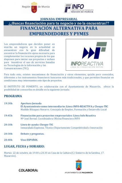 Este martes 22 de octubre el Instituto de Fomento (INFO) de la Región de Murcia celebra, en el Centro Cultural de Mazarrón, la Jornada empresarial 'Financiación alternativa para emprendedores y PYMES: Inforeactiva y Cheque TIC'. La jornada dará comienzo a las 19:30 horas y, durante la misma, se dará a conocer el 'Cheque TIC', una iniciativa del INFO en colaboración con la Dirección General de Patrimonio, Informática y Telecomunicaciones y la Dirección General de Presupuestos y Fondos Europeos de la Comunidad Autónoma de la Región de Murcia; que tiene como principal objetivo aumentar el número de empresas innovadoras en la Región.