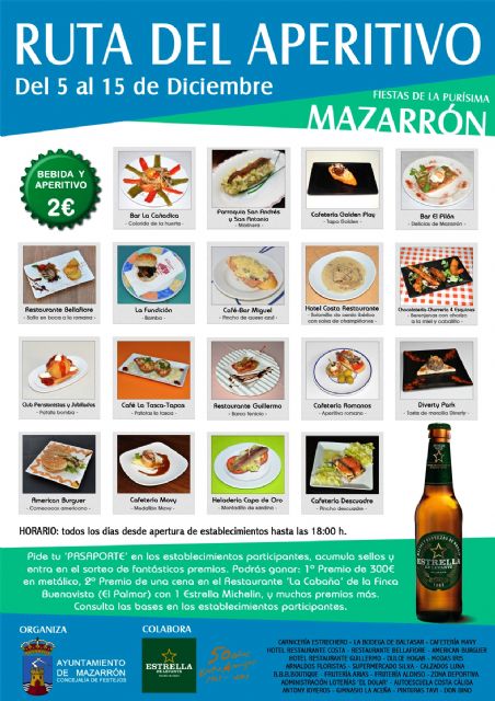 La concejalía de Festejos del Ayuntamiento de Mazarrón ya lo tiene todo listo para celebrar del 5 al 15 de diciembre las Fiestas Patronales en honor a la patrona, La Purísima Concepción. La primera de las actividades que se ha presentado ha sido la 'Ruta del Aperitivo' que por primera vez se celebra dentro de estos festejos como ha indicado el concejal de Festejos, Isidro Coy, quien ha estado acompañado en la presentación por el responsable del área, José Baltasar.