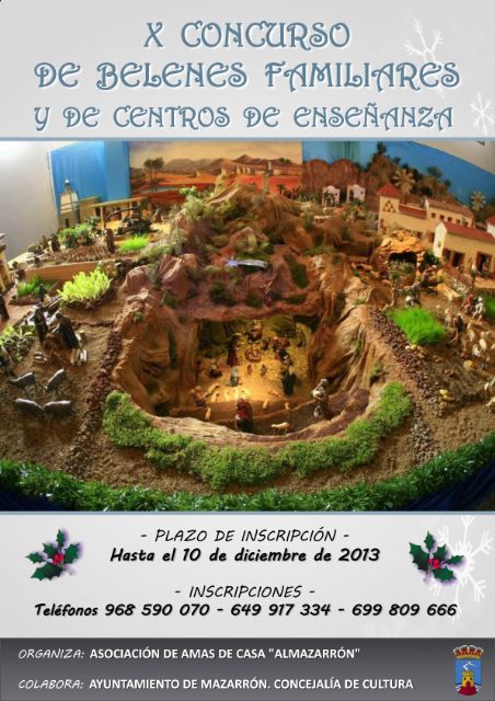 Hasta el martes 10 de diciembre se encuentra abierto el plazo de inscripción para participar en el 'X Concurso de Belenes Familiares y de Centros de Enseñanza' que organiza la Asociación de Amas de Casa, Usuarios y Consumidores 'Almazarrón' y en el que colabora la concejalía de Cultura del Ayuntamiento de Mazarrón. Los interesados en participar pueden formalizar su inscripción a través de los teléfonos 968 590 070, 649 917 334 ó 699 809 666.
