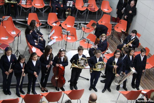 La primera parte del concierto estuvo a cargo de la banda-escuela, formada por los alumnos y alumnas de la escuela de música que están iniciándose en la práctica instrumental de conjunto. Antes de comenzar fueron presentados diez nuevos músicos de la banda-escuela. Clarinete: Ana Méndez Noguera; flautas: Nerea Méndez Zamora, Marta Navarro Caballero y Teresa Zamora Ballesta; Violonchelo: Alba Mª González Ardil; trompas: Celia Méndez Pérez y José Ruiz Ortiz; trompeta: Alejandra Rodríguez Muñoz; Bombardino: Andrea Méndez Zamora; percusión: Gabriel José Costa Martínez. Seguidamente la banda-escuela interpretó cuatro fragmentos sencillos acordes al nivel de los jóvenes músicos debutantes.