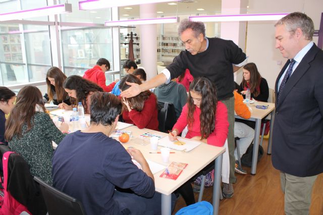 Esta mañana el pintor blanqueño Pedro Cano ha regresado a Mazarrón donde ha mantenido un encuentro con más de un centenar de estudiantes del municipio a los que ha enseñado a desenvolverse con la técnica de la acuarela. Concretamente, los alumnos que han participado en esta actividad con el pintor han sido los alumn@s de 3° de Primaria del C.E.I.P. 'Ginés García' y de 3° de la E.S.O. del I.E.S. 'Domingo Valdivieso'.