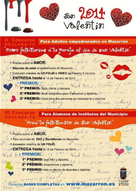 El próximo miércoles 12 de febrero se cierra el plazo del concurso de poesía y cartas de amor 'Declára-te', convocado una año más por la concejalía de Cultura del Ayuntamiento de Mazarrón. Este año se celebra la III edición para alumnos de ESO y Bachillerato del municipio y la II edición destinada a los adultos empadronados en Mazarrón. La concejala del área, María Celeste Soria, ha recordado que "este certamen se encuadra dentro de las actividades para la promoción y fomento de la lectura que llevamos a cabo desde las bibliotecas municipales".