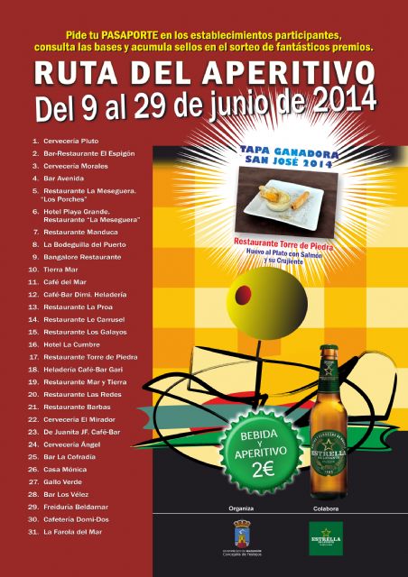 Del 9 al 29 de junio se celebra en la zona costera del municipio una nueva 'Ruta del Aperitivo' a semejanza de la celebrada en las pasadas fiestas de San José, la cual obtuvo un gran éxito de participación. Así lo dieron a conocer ayer el Alcalde de Mazarrón, Ginés Campillo, el concejal de Festejos, Isidro Coy, y el responsable del área, José Baltasar Navarro. 31 establecimientos participan en esta nueva ruta que seguirá manteniendo el precio de la tapa más bebida (cerveza, vino, refresco o agua) a 2 euros.
