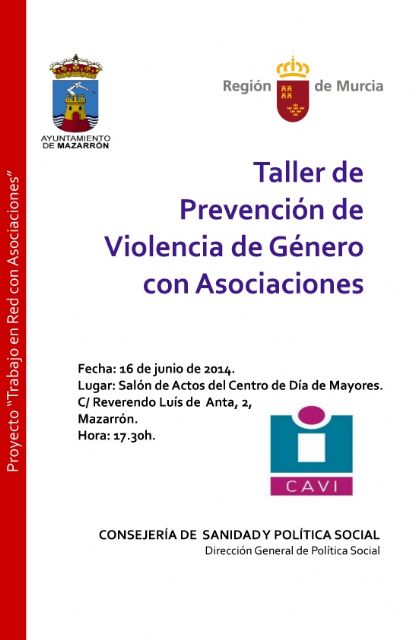 La dirección general de Política Social de la CARM, en colaboración con la concejalía de Política Social del Ayuntamiento de Mazarrón, van a desarrollar este lunes 16 de junio el 'Taller de Prevención de Violencia de Género con Asociaciones'. Una actividad que se enmarca dentro del proyecto 'Trabajo en Red con las Asociaciones' y que se celebrará a las 17:30 horas en el Salón de Actos del Centro de Día de Personas Mayores de Mazarrón