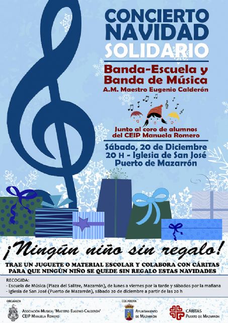 Este año, la Asociación "Maestro Eugenio Calderón" ha organizado una recogida de juguetes y de material escolar a beneficio de Cáritas de Puerto de Mazarrón para que ningún niño se quede sin regalo en estas fiestas. La recogida se lleva haciendo durante toda la semana y continuará antes y después del concierto.