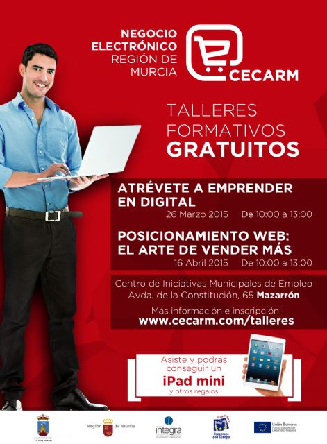 La Concejalía de Desarrollo de Empleo, Formación y Desarrollo Local del Ayuntamiento de Mazarrón ha programado dos nuevos talleres formativos gratuitos junto al Cecarm, el portal de Comercio, Factura y Negocio Electrónico de la Región de Murcia. El primero de ellos lleva el nombre de "Atrévete a emprender en digital". Se realizará el 26 de marzo de 10 a 14 horas en el Centro de Iniciativas Municipales de Empleo (CIME).