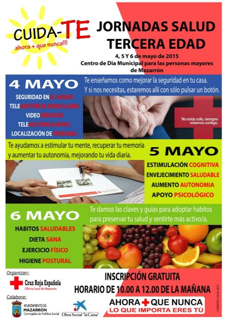 Durante los días 4, 5 y 6 de mayo La Oficina Local de Cruz Roja en Mazarrón desarrollara en colaboración con el Ayuntamiento de Mazarrón y La Obra Social de La Caixa, unas jornadas dedicadas al fomento de los hábitos saludables en la Tercera Edad. La actividad tiene lugar en el Centro de Día de Mazarrón, en horario de 10 a 12 de la mañana.
