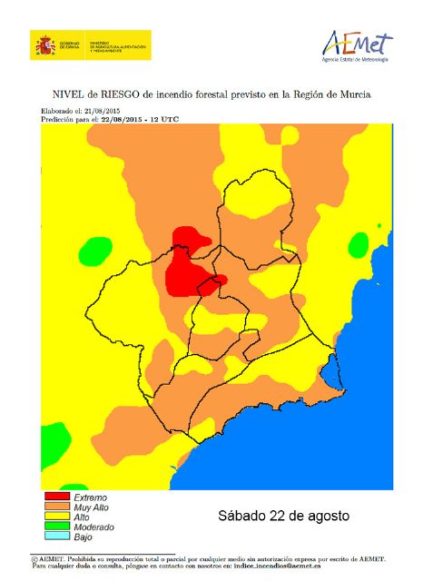 La Agencia Estatal de Meteorología (AEMET) mantiene para los días 21 y 22 de agosto el aviso de riesgo muy alto de incendios en toda la franja del litoral de la Región de Murcia. Predicción que pasa a riesgo extremo el domingo 23 de agosto. Este hecho ha obligado en la mañana de este viernes a suspender la actividad del lanzamiento solidario de farolillos a beneficio de Cáritas previsto inicialmente para el sábado 15 de agosto y que por las mismas circunstancias había quedado aplazado a este sábado 22 de agosto a las 23 horas en la playa del paseo de Puerto de Mazarrón.