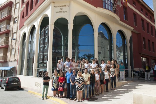 Empleados municipales y miembros de la corporación guardan un minuto de silencio para condenar la última muerte por violencia de género acontecida en la Región de Murcia.