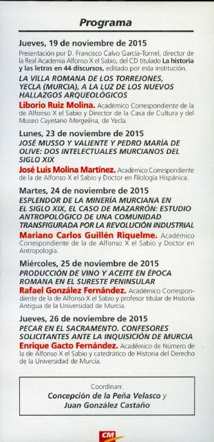 El ciclo de conferencias del 75 aniversario de la Real Academia Alfonso X el Sabio comenzó este jueves 19 de noviembre y se extenderá hasta el jueves 26 de noviembre. Ese día será clausurada por el catedrático de Historia del Derecho y académico de número, Enrique Gacto, con una conferencia titulada "Pecar en el Sacramento. Confesores Solicitantes ante la Inquisición de Murcia".