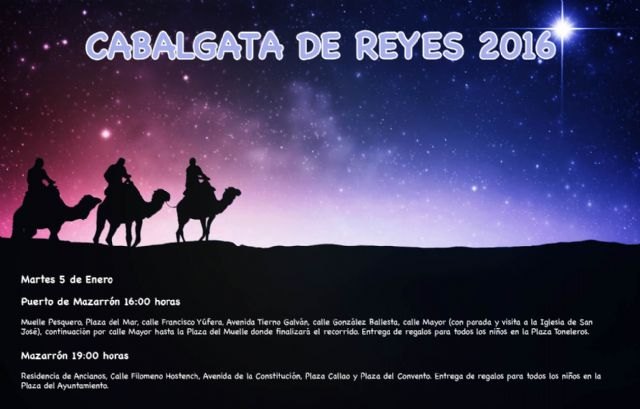 Los tres Reyes Magos de Oriente llegarán en barco este martes a Puerto de Mazarrón. Melchor, Gaspar y Baltasar ya están de camino y se espera su llegada al muelle pesquero en torno a las 16:00 horas del 5 de enero. Sus Majestades subirán a una carroza para iniciar la esperada cabalgata que recorrerá las principales calles primero de Puerto de Mazarrón y más tarde de Mazarrón. Irán acompañados de una carroza representativa del Nacimiento y otra de pastores, además de las escuelas de baile Antonio Jara, Juan Antonio Iglesias y De Rosa. Un grupo de jinetes cerrará el desfile en Mazarrón. En Puerto de Mazarrón, Sus Majestades visitarán la Iglesia de San José donde adorarán al Niño.