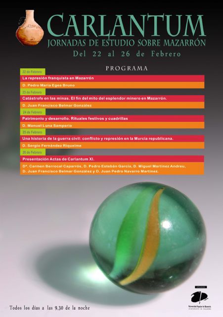 La conferencia de Manuel Luna es la tercera de esta nueva edición de Carlantum, tras las intervenciones en días pasados de Pedro María Egea y Juan Manuel Belmar, quienes trataron "La represión franquista en Mazarrón" y la "El fin del mito del esplendor minero en Mazarrón". Carlantum continuará el jueves 25 de febrero con la intervención de Sergio Fernández Riquelme quien ofrecerá la ponencia "Una historia de la guerra civil: conflicto y represión en la Murcia republicana".